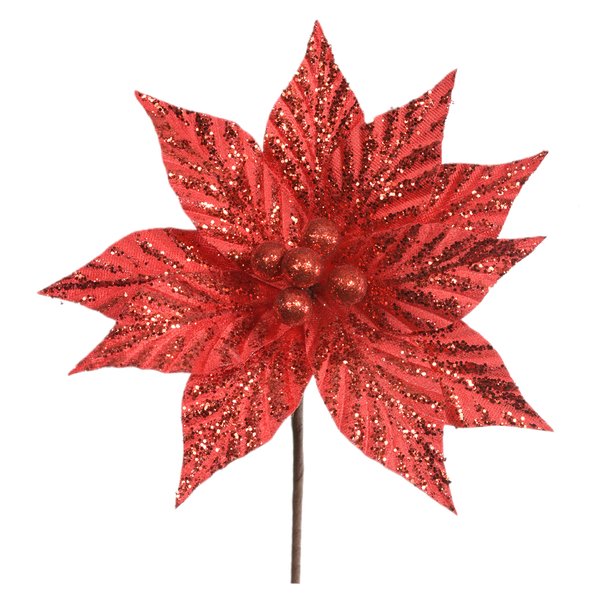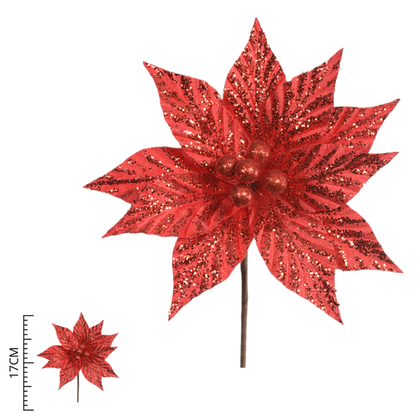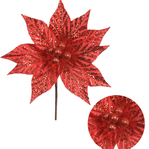 Essa flor decorativa é perfeita para enfeitar árvores de Natal, guirlandas, arranjos de mesa, cestas decorativas e painéis festivos. Sua cor vermelha vibrante e acabamento com glitter combinam com decorações clássicas, glamourosas ou rústicas.